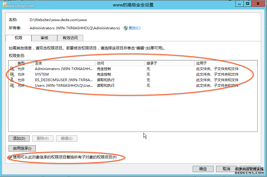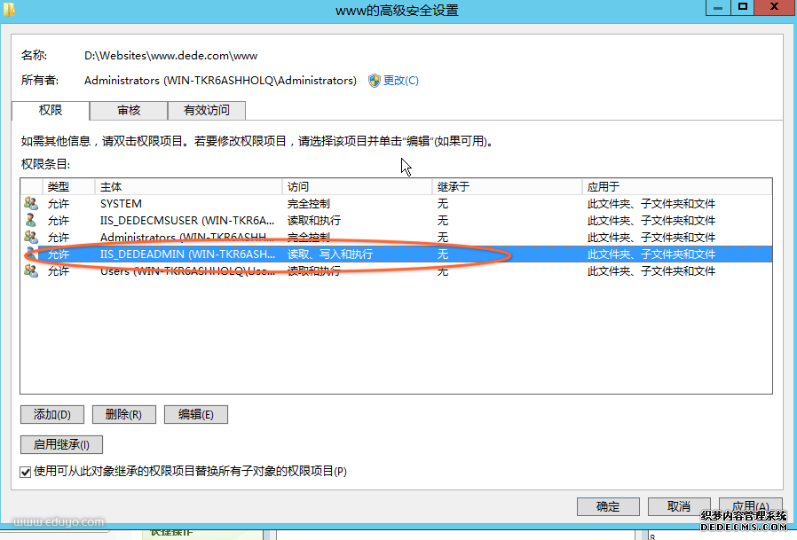 (2)站点根目录文件夹设定权限“D:Websiteswww.dede.comwww”,我们在文件夹右键属性,在“安全”选项卡的“高级”中设定文件夹权限(如图6.1-2);