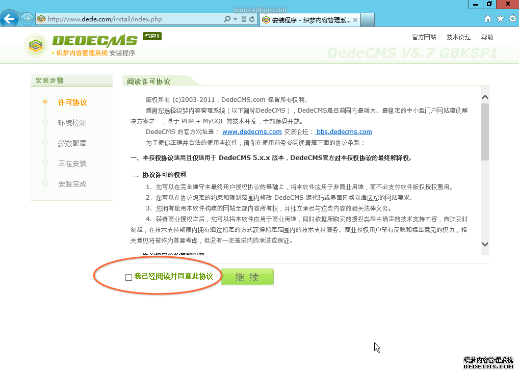 (3)在浏览器中输入“www.dede.com”,这时候我们能够看到安装页面,按照安装提示进行安装(如图5.3-1);