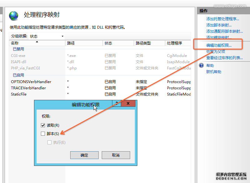 (3)我们需要取消uploads、data以及生成静态html文件目录的执行权限,可以在IIS站点功能试图的“处理程序映射”中“编辑功能权限...”,取消脚本执行权限(如图6.1-3)。