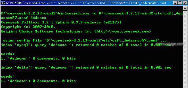 search.exe -c D:\coreseek-3.2.13-win32\etc\csft_dedecmsv57.conf dedecms