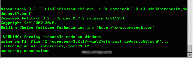 searchd.exe -c D:\coreseek-3.2.13-win32\etc\csft_dedecmsv57.conf