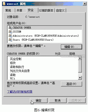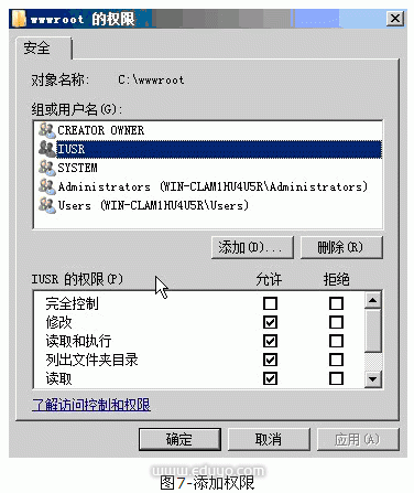 打开“编辑”窗口后点击“添加”按钮。添加一个“IUSR”到权限用户列表中,然后为其勾选除了“完全控制”之外的权限。然后点击“确定”。(图7)