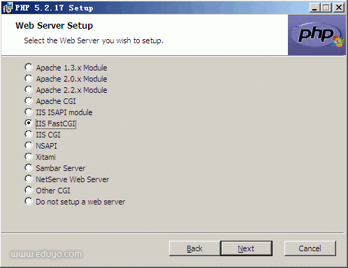 - 在前面已经提过,IIS7中不必单独安装fastcgi,所以,我们只需要下载php安装包进行安装即可,下载地址:http://windows.php.net/downloads/releases/archives/ 下载好后,打开安装程序,经过引导,配置好路径,来到选择“web server setup”的地方,在这里我们选择“IIS fastcgi”(图9)