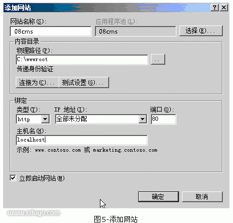 再新建一个网站,在“网站”上右击,点击添加网站,会出现信息网站添加的表单,首先输入网站名称,例如“08cms”,路径选择为网站存放的路径,单IP的服务器可以不必选择IP,主机头填写为localhost,然后点击确定。