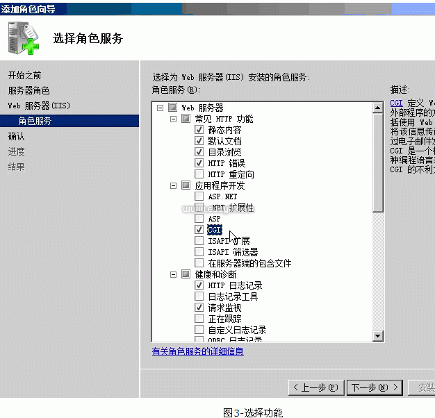 点击“下一步”之后,需要选择功能,这里需要比默认选项多增加一个“cgi”(图3)
