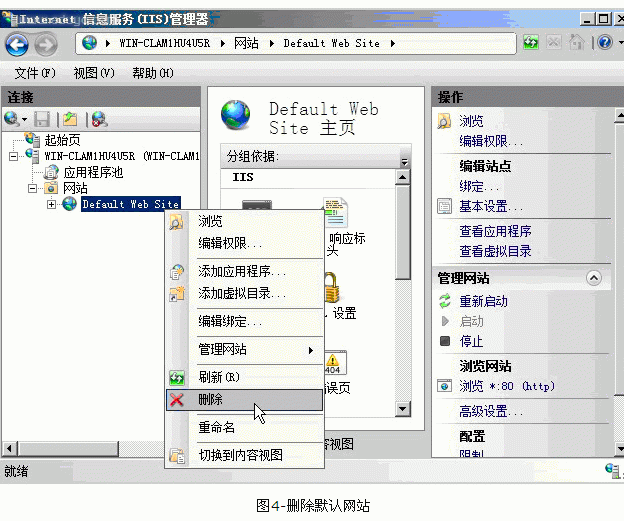 然后删除默认网站,在主菜单中,展开网站菜单,然后再网站名称上右键,点击删除即可(图4)