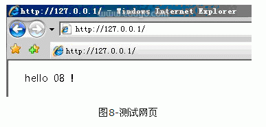 结束此步骤后,就可以访问本地地址“http://127.0.0.1”进行测试了,网页上显示出了“hello 08”,说明配置成功