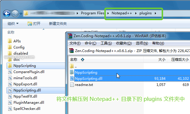 将解压所得的文件放入 Notepad++ 程序的安装目录下的plugins文件夹。