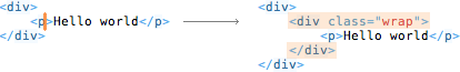 比如,我们想让写好的 <p>hello world</p> ,想在外层再套一个div,只需按下【Ctrl+Shift+A】,在弹出的对话框中输入: div.wrap,回车。此标签就能自动被嵌套。