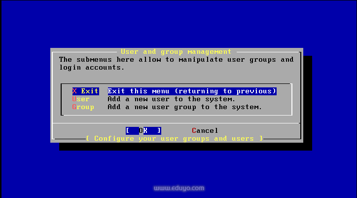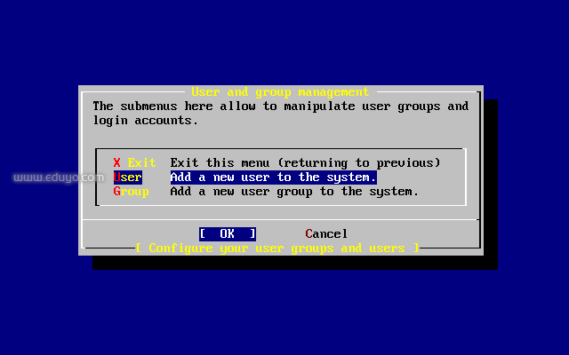 选择 Exit 后切到 [OK] 按下 [Space] 或 [Enter] 完成用户管理.