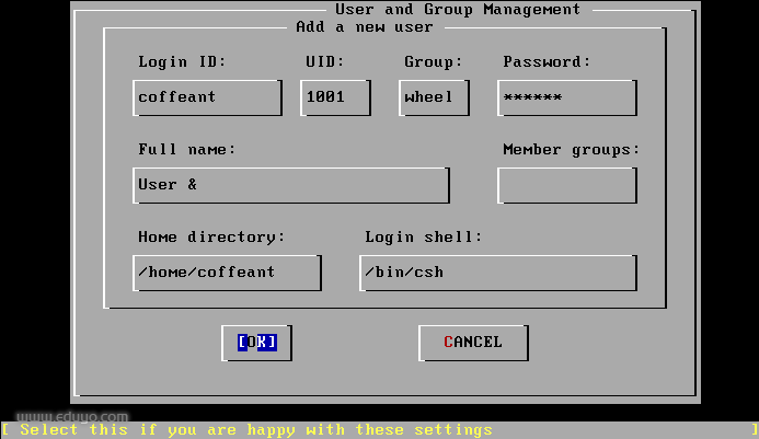 建议,将第一个用户加入到 wheel 组当中,让其可以远程 ssh 到主机并 su 成 root 用户.另外给其设定 shell 为 csh,否则没有 tab 自动补齐功能.