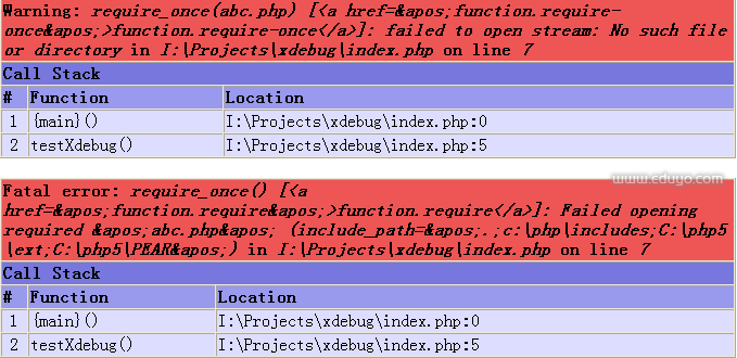 发现了什么? Xdebug跟踪代码的执行,找到了出错的函数testXdebug()。站长教学网 eduyo.com