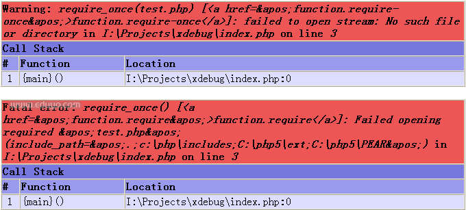 我们先写一个可以导致执行出错的程序,例如尝试包含一个不存在的文件。