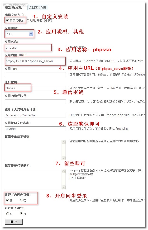 登录Discuz! X2.5后台,进入“UCenter”,点击“应用管理”后点击“添加新应用”进入应用添加界面,设置如下: