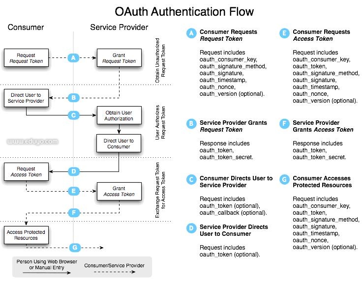 E. Request Token 授权后,使用者将向Access Token URL发起请求,将上步授权的Request Token换取成Access Token。请求的参数见上图,这个比第一步A多了一个参数就是Request Token。