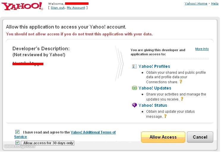 一些服务提供商不仅仅仅实现了OAUTH协议上的功能,还提供了一些更友好的服务,比如管理第三方软件的授权服务。下图就是YAHOO管理软件授权的页面,用户可以取消都某些应用的授权。