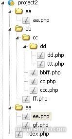 看我们的实验图,在图中项目下分别有aa bb ee 三个同级目录和一个index.php文件,在bb下又有cc目录,cc下又有dd目录和cc.php ccc.php两个文件,同样dd下也包含一个dd.php文件。凡是上层对下层均属上级引用.