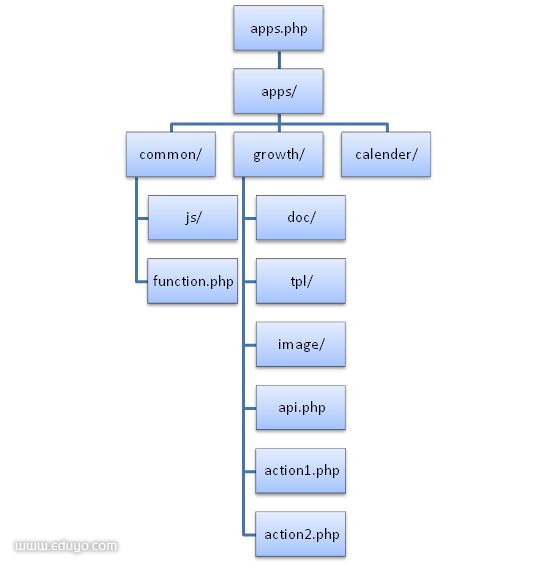 - 以apps.php作为入口文件,所有应用都使用类似apps.php?do=growth&ac=list这样的URL访问应用程序。 其中do为应用名称,ac为动作(执行的脚本名)。例如上面的例子,实际是以apps.php为入口,再加载apps/growth/list.php。