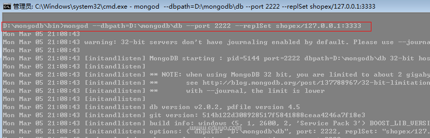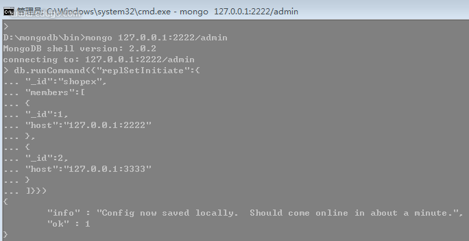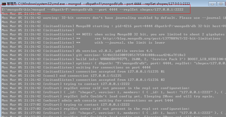 第一步: 既然我们要建立集群,就得取个集群名字,这里就取我们的公司名shopex, --replSet表示让服务器知道shopex下还有其他数据库,