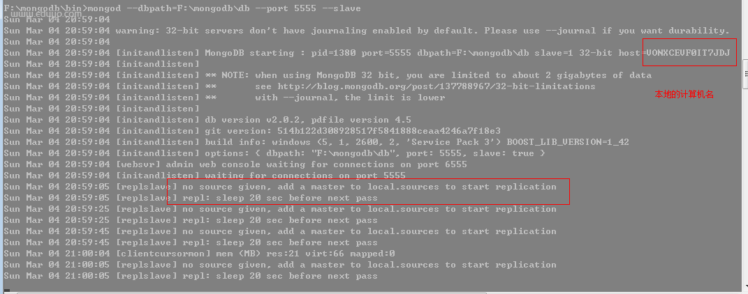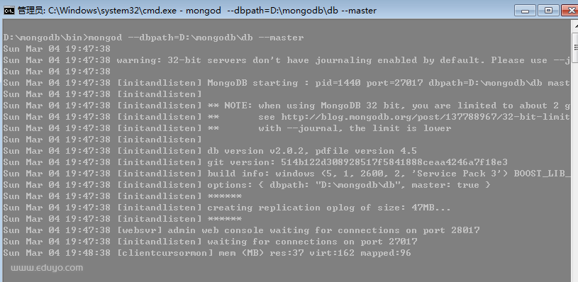 第二步:启动D盘上的mongodb,把该数据库指定为主数据库,其实命令很简单:>mongodb --dbpath='XXX' --master,