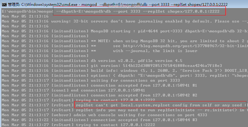 第三步: ok,看看上面的日志红色区域,似乎我们还没有做完,是的,log信息告诉我们要初始化一下“副本集“,既然日志这么说,那我也就