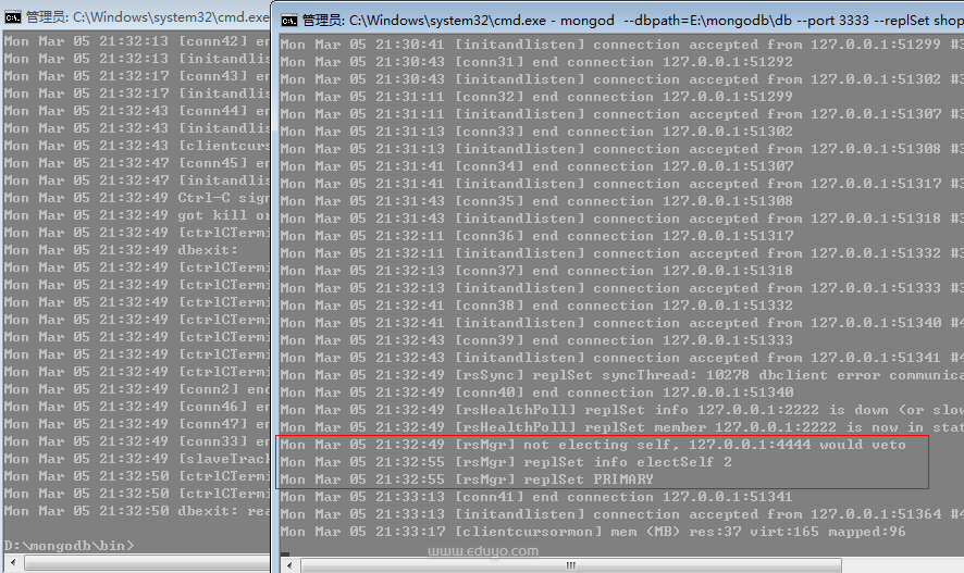这里就把D盘里面的mongodb程序打开,端口为2222。指定端口为3333是shopex集群下的另一个数据库服务器。