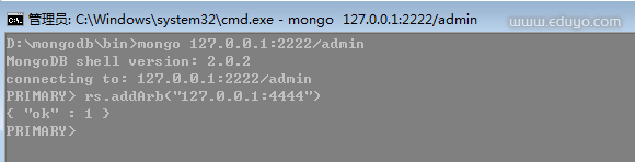 然后我们在admin集合中使用rs.addArb()追加即可。