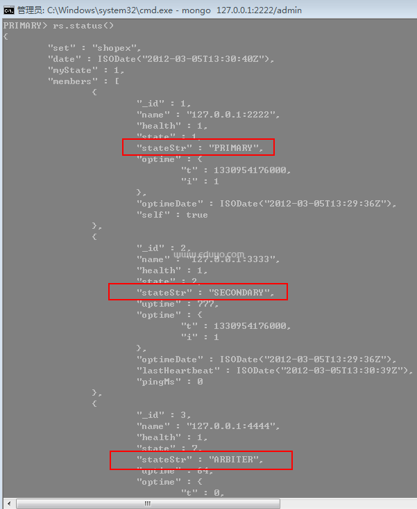 追加好了之后,我们使用rs.status()来查看下集群中的服务器状态,图中我们可以清楚的看到谁是主,还是从,还是仲裁。