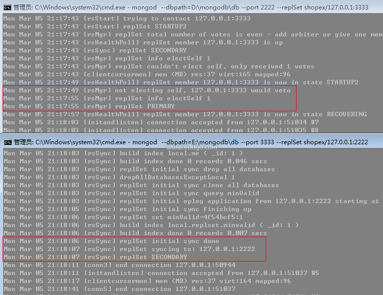在3333端口的从属服务器即可顶上,最后大家也可以再次使用rs.status()来看下集群中服务器的状态。