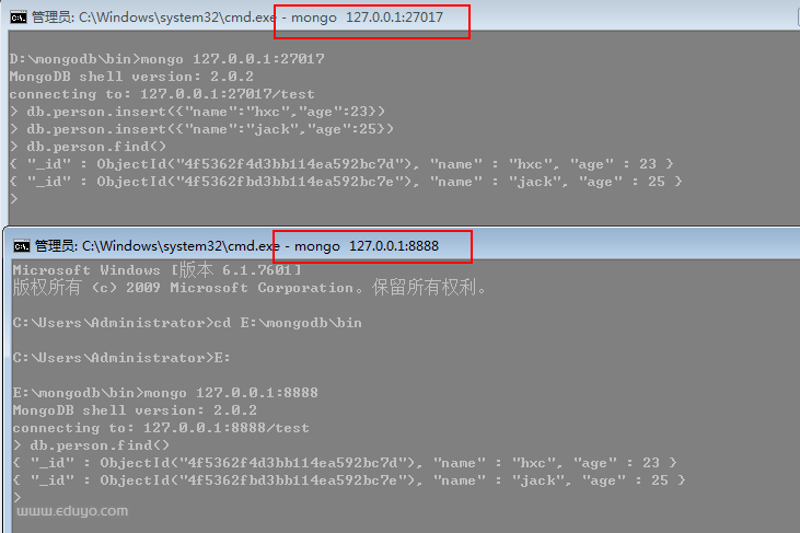 第三步:同样的方式启动E盘上的mongodb,指定该数据库为从属数据库,命令也很简单,当然我们要换一个端口,比如:8888。