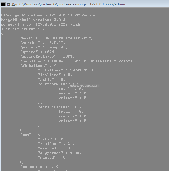 这个函数可以获取到mongodb的服务器统计信息,其中包括 :全局锁,索引,用户操作行为等等这些统计信息,对管理员来说非常