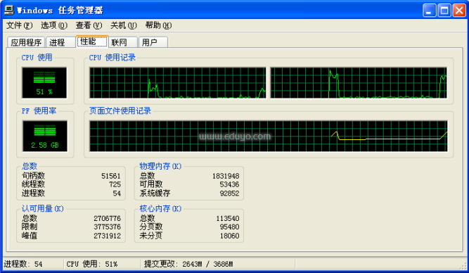 不过我最大的一次配置该值的大小为1300M,运行验证程序后我的电脑几乎处于休眠状态,呵呵,下面是性能占用图: