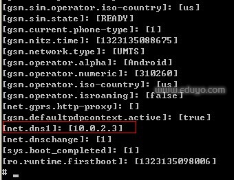 在地下#后面输入 getprop 回车 我们会看到模拟器的DNS是10.0.2.3 见下图