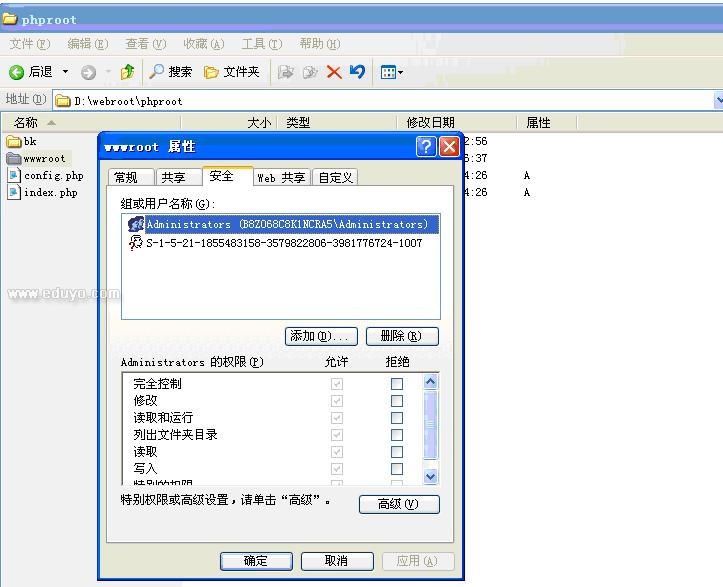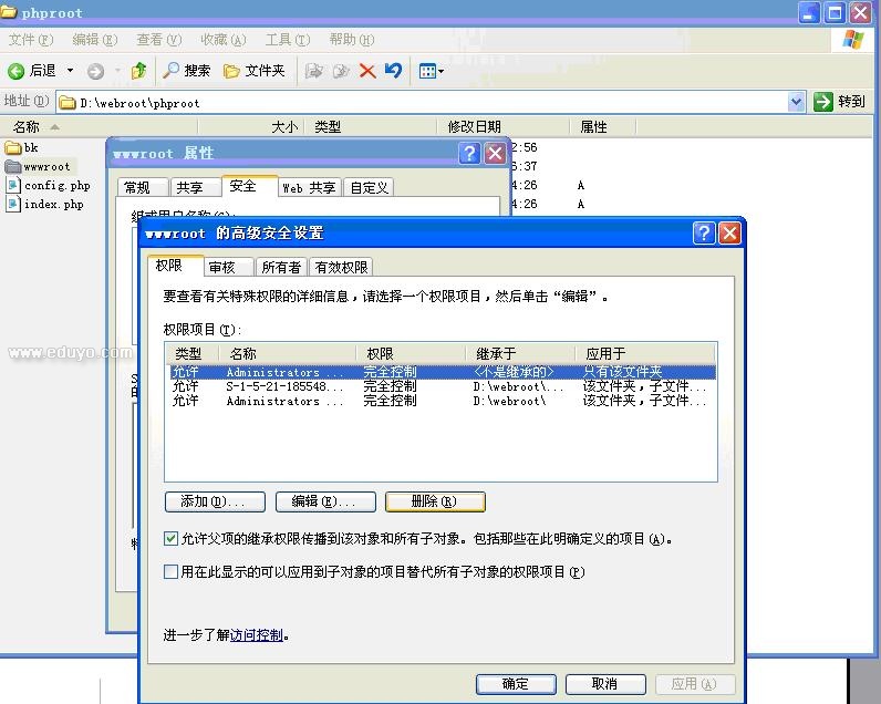 (1-2) 这个文件夹邮件属性里的安全选项卡,把系统默认的用户都给删了只留administrators 如1-1 如果删不掉就点高级(如1-2)把允许父项的继承权限的勾去掉,提示你的时候点复制。然后确定后你就可以删除用户了。