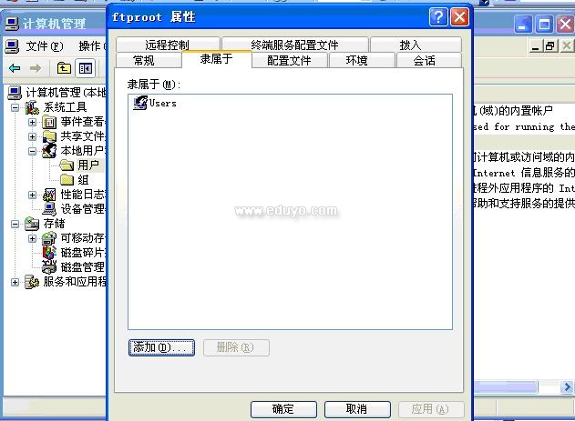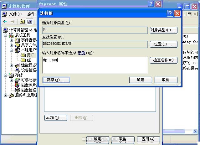 然后添加ftp_user组 点确定后再点ftproot 属性下面的确定。这样我们一个拥有FTP登陆权限的用户就建立成功了,还有最后一步就成功了。
