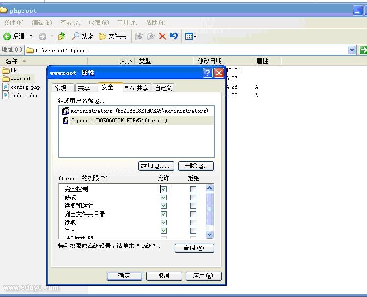 删除多余用户后我们再给他 ftproot 这个用户的权限,并允许它完全控制。然后点确定。 这步可以说是最后一步了,我们用FTP软件登陆测试一下 IE里打开ftp://192.168.1.2 (我电脑IP是这个,你不一定跟着我填这个)帐号是 ftproot 密码是 111111 登陆成功能看到你FTP文件夹里的文件就成功了。