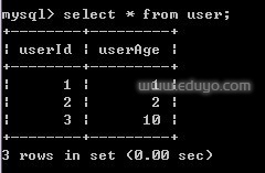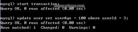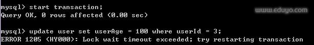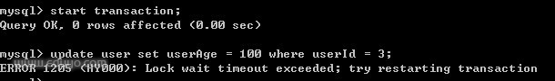 8)B表重新开始事务,并对user表进行修改,修改被挂起,直到超时,对另一条记录修改却成功,说明A对表进行修改时加了行共享锁(可以select)