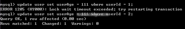 7)B重新开始事务,并对user表同一条进行修改,发现修改被挂起,直到超时,但对另一条记录修改,却是成功,说明A的修改对user表加上了行共享锁(因为可以select)